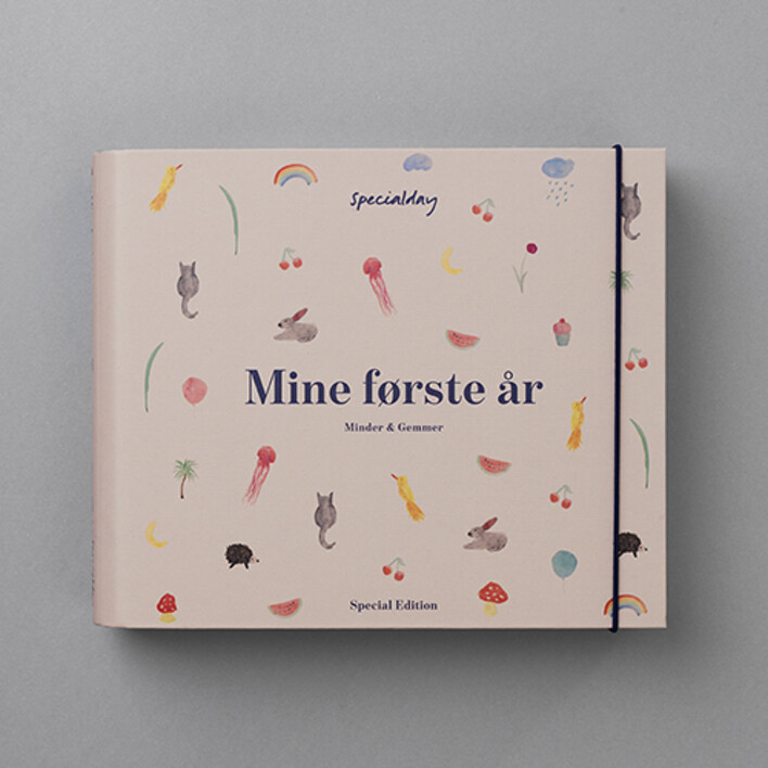'Mine første år – minder & gemmer' er en helt unik og smuk illustreret barnets bog der kan indeholde alle de fantastiske minder fra barnets første tid. Der er plads til alt fra tanker og følelser under graviditeten, babys første fodaftryk og den lille bløde hårlok til alle de vidunderlige billeder og dyrebare minder, man skal huske at skrive ned, inden tiden flyver væk med dem. Albummet indeholder desuden masser af gode ideer til aktiviteter og lege med baby samt gode råd til forældre om nogle af de små og store udfordringer livet med en lille ny byder på. Desuden er bogen inddelt med faner i kategorier der kommer rundt om hele barnets udvikling ligesom de 5 smarte lommer i bøgerne er geniale til opbevaring. ‘Mine første år – minder og gemmer’ fåes også med et creme og et blåt omslag, - indholdet i albummene er det samme uanset omslag og passer både til den klassiske familietype og regnbuefamilier.